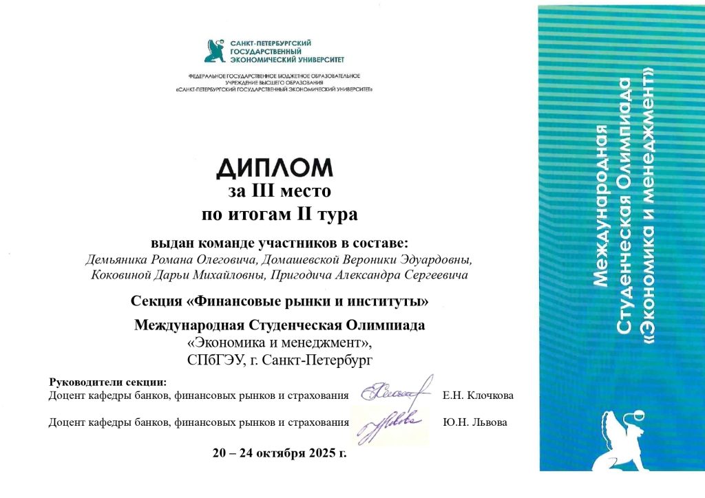 С 20 по 24 октября в СПбГЭУ (г. Санкт-Петербург) прошла Международная студенческая олимпиада "Экономика и Менеджмент". Команда наших студентов 4 курса бакалавриата и 1 курса магистратуры участвовала в секциях "Финансы", "Финансовые рынки и институты", "Учёт и анализ".