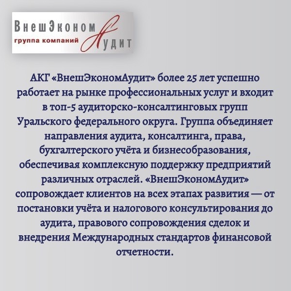 Аудиторско-консалтинговая группа «ВнешЭкономАудит» приглашает студентов старших курсов и выпускников ЮУрГУ, заинтересованных в профессиональном развитии и карьере в сфере аудита, консалтинга и маркетинга, рассмотреть возможность трудоустройства.