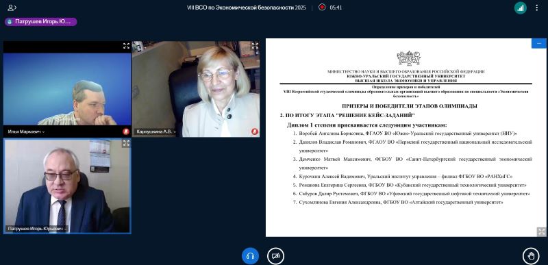 Председатель жюри и постоянный партнер кафедры «Экономическая безопасность» – генеральный директор консалтинговой компании «ОБиКон», председатель Регионального совета по оценочной деятельности в Челябинской области, эксперт-оценщик Игорь Патрушев поздравил всех с завершением олимпиады, пожелал участникам удачи и практического применения результатов олимпиады, также поблагодарил коллектив преподавателей кафедры экономической безопасности ЮУрГУ, которые сопровождали участников олимпиады.