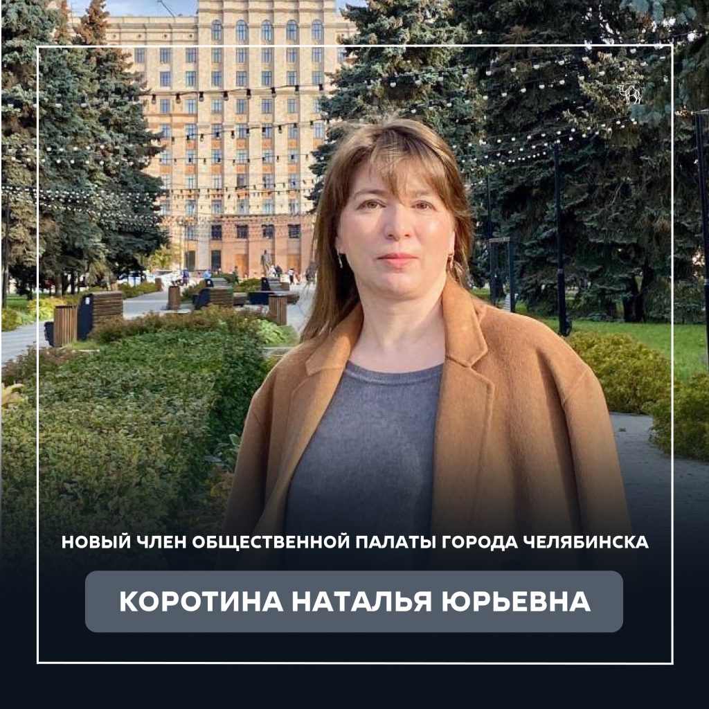 На основании Решения 14/22 от 25.11.2025 «О внесении изменений в решение Челябинской городской Думы 5/42 от 17.12.2024 «Об утверждении первых девяти членов Общественной палаты города Челябинска» в состав Общественной палаты города вошла Наталья Коротина, профессор кафедры экономической безопасности, Высшей школы экономики и управления ФГАОУ «Южно-Уральский государственный университет» (НИУ), имеет ученую степень доктора экономических наук, ученое звание доцента.